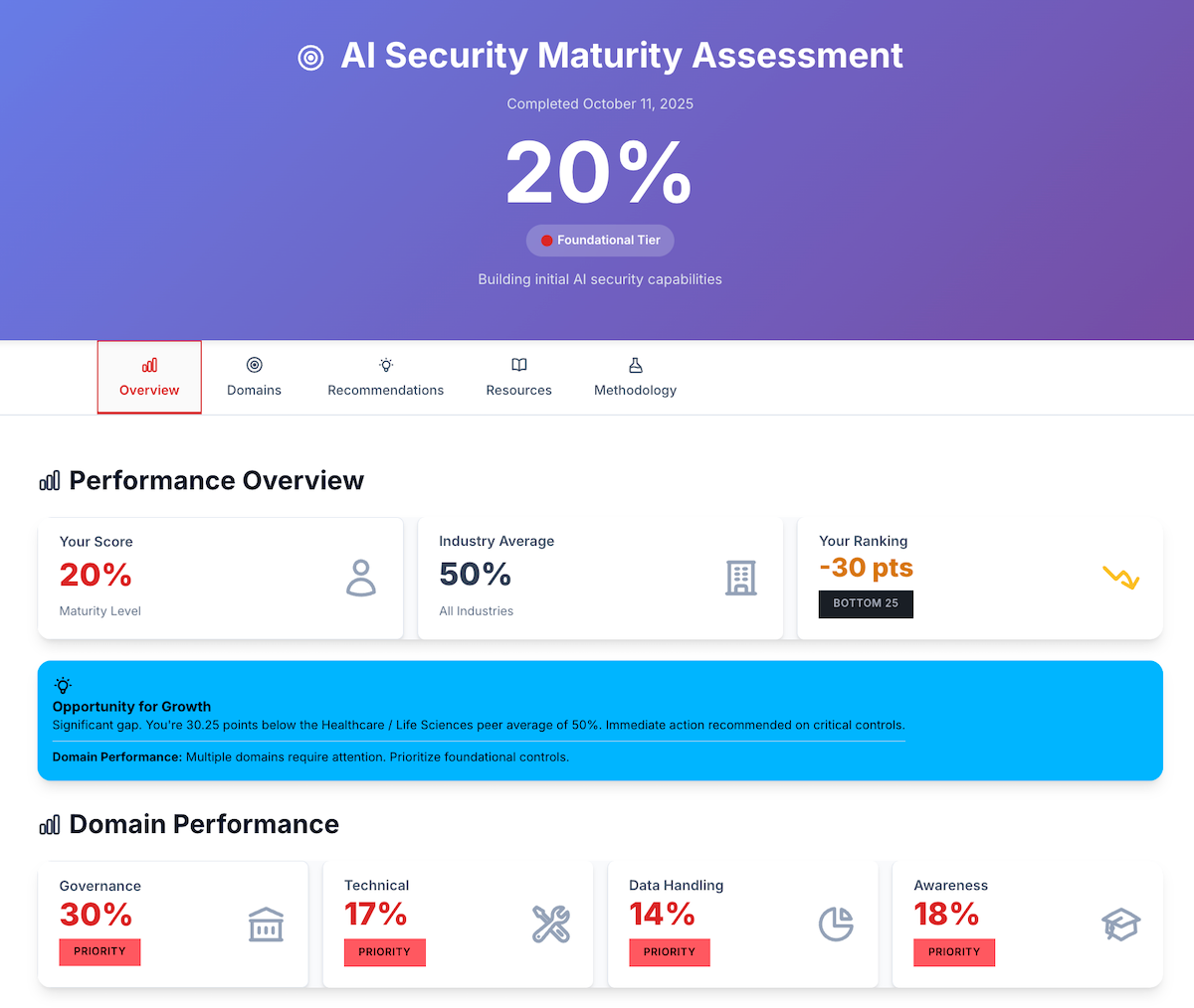 ✓ Benchmark Insights - How your AI security maturity compares to industry standards